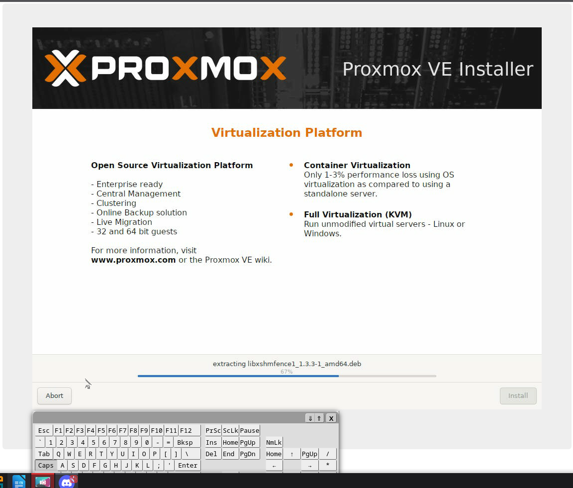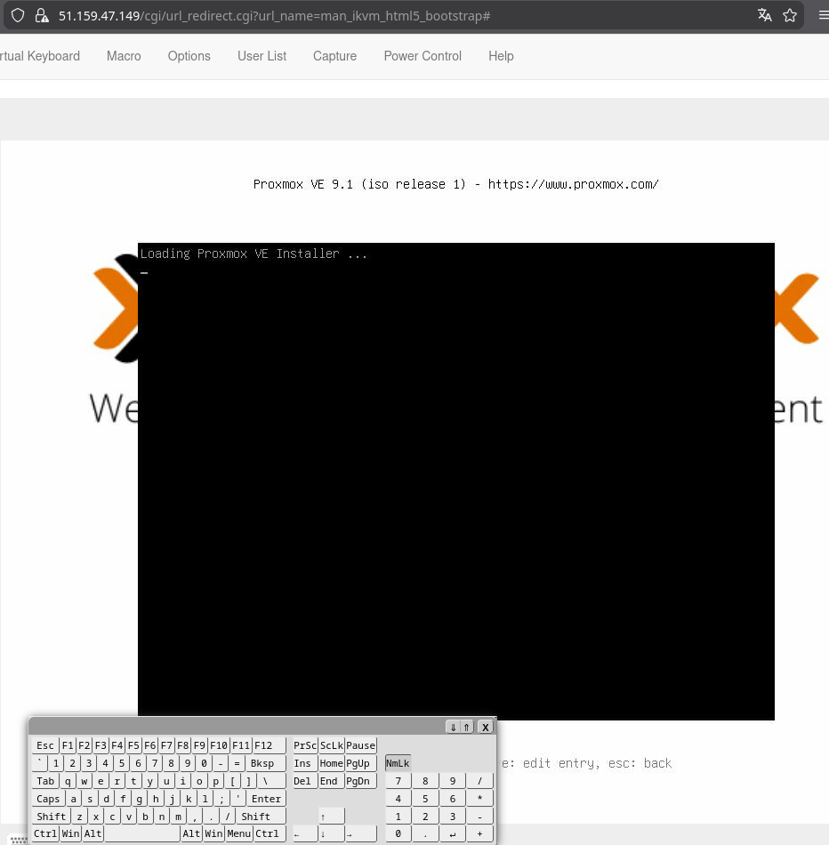 Monter l'ISO via l'interface KVM de Scaleway, puis démarrer le serveur. Sélectionner Install Proxmox VE (Graphical).