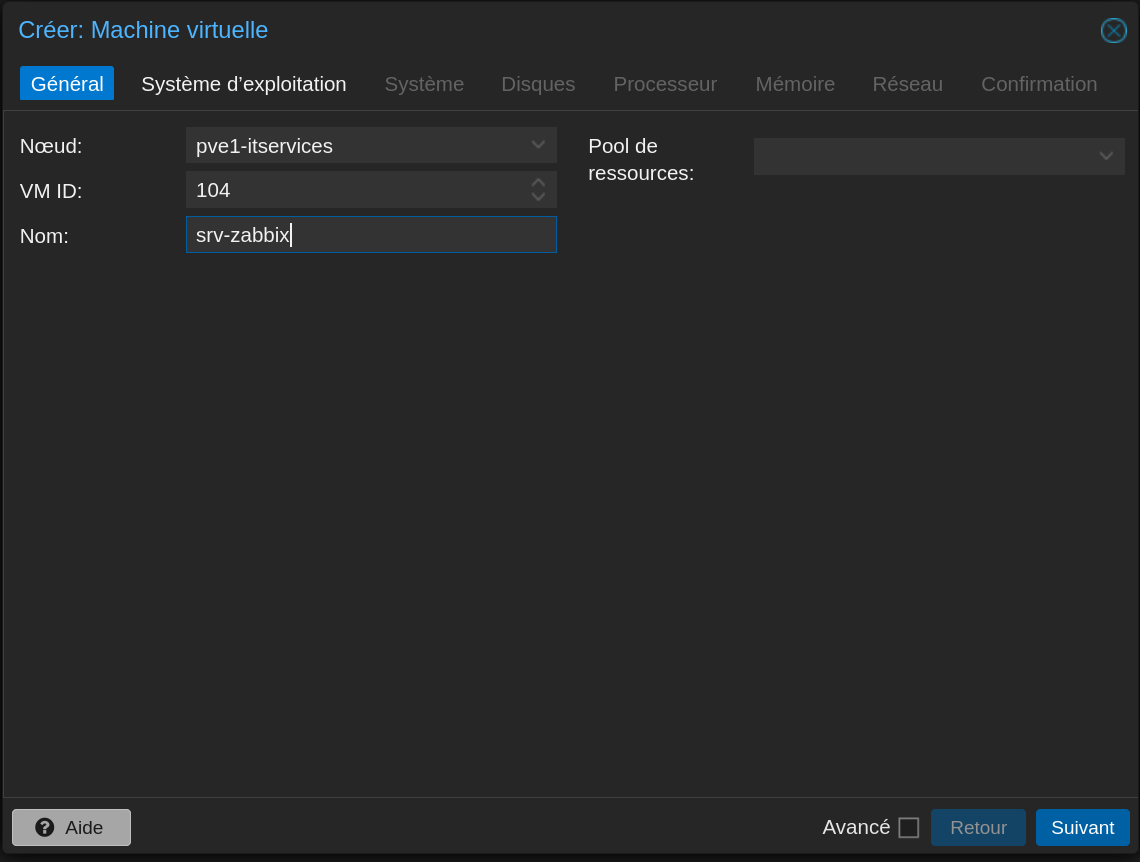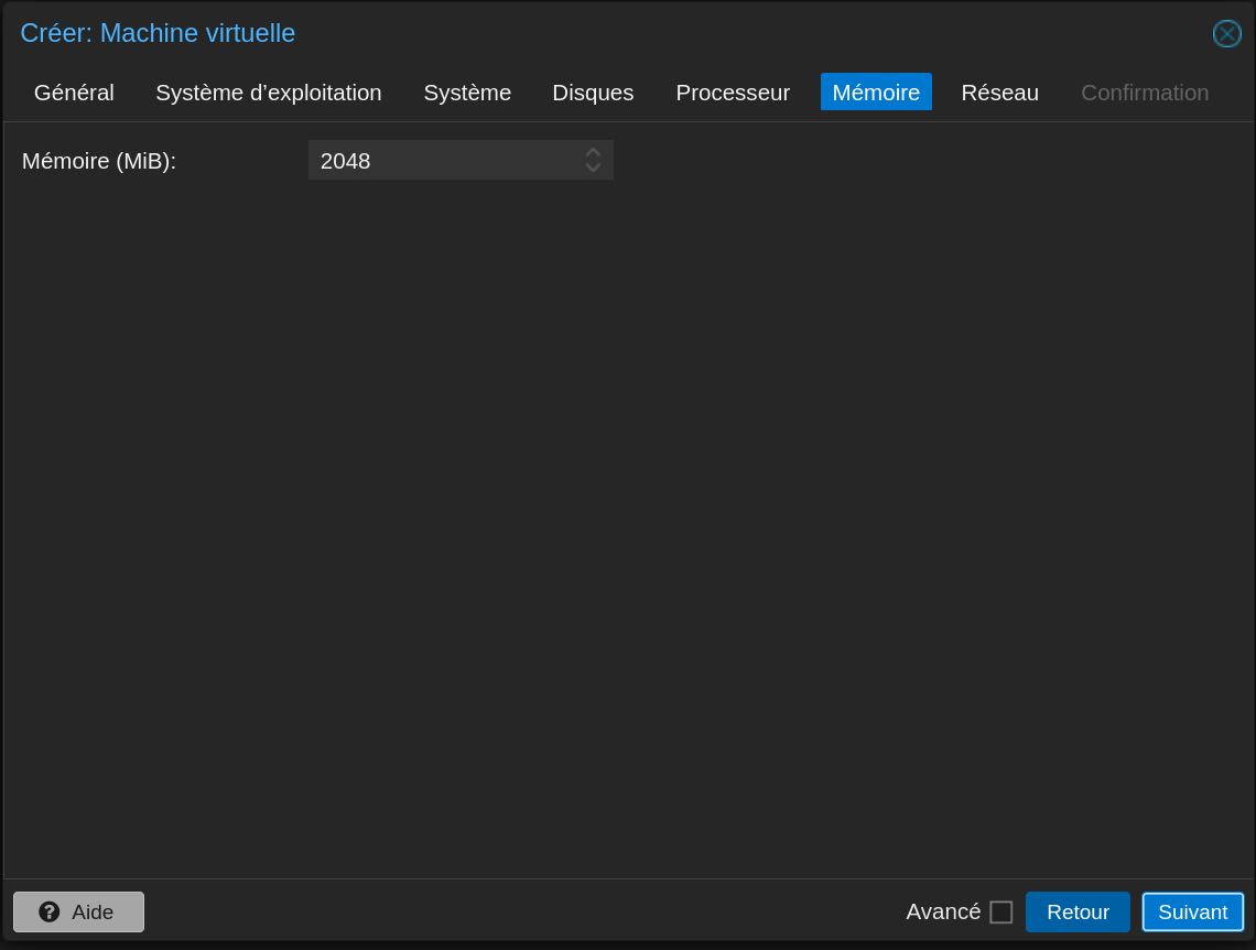 Pour chaque VM, aller dans l'interface web Proxmox > Créer VM et suivre l'assistant.