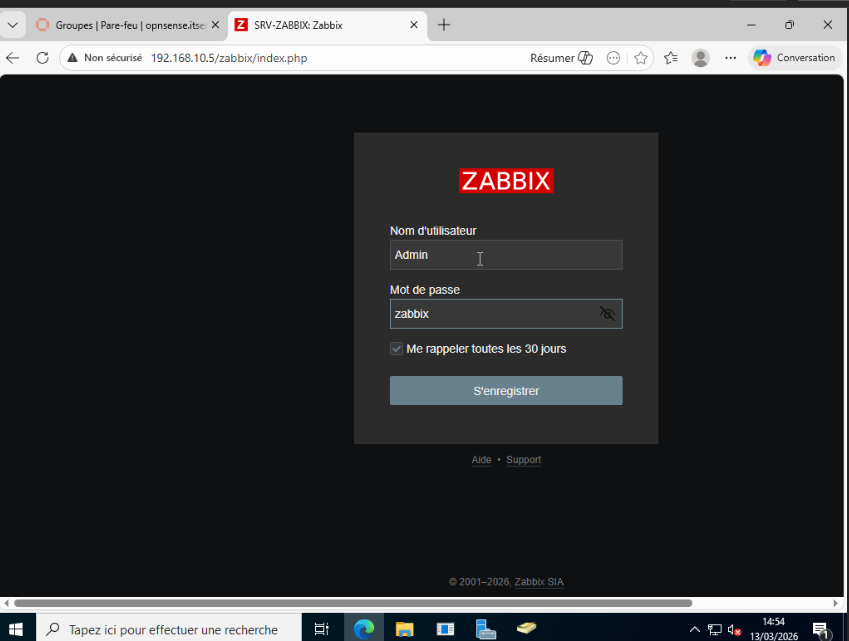Architecture réseau virtualisée sous Proxmox VE : AD DS, pare-feu OPNsense et monitoring Zabbix