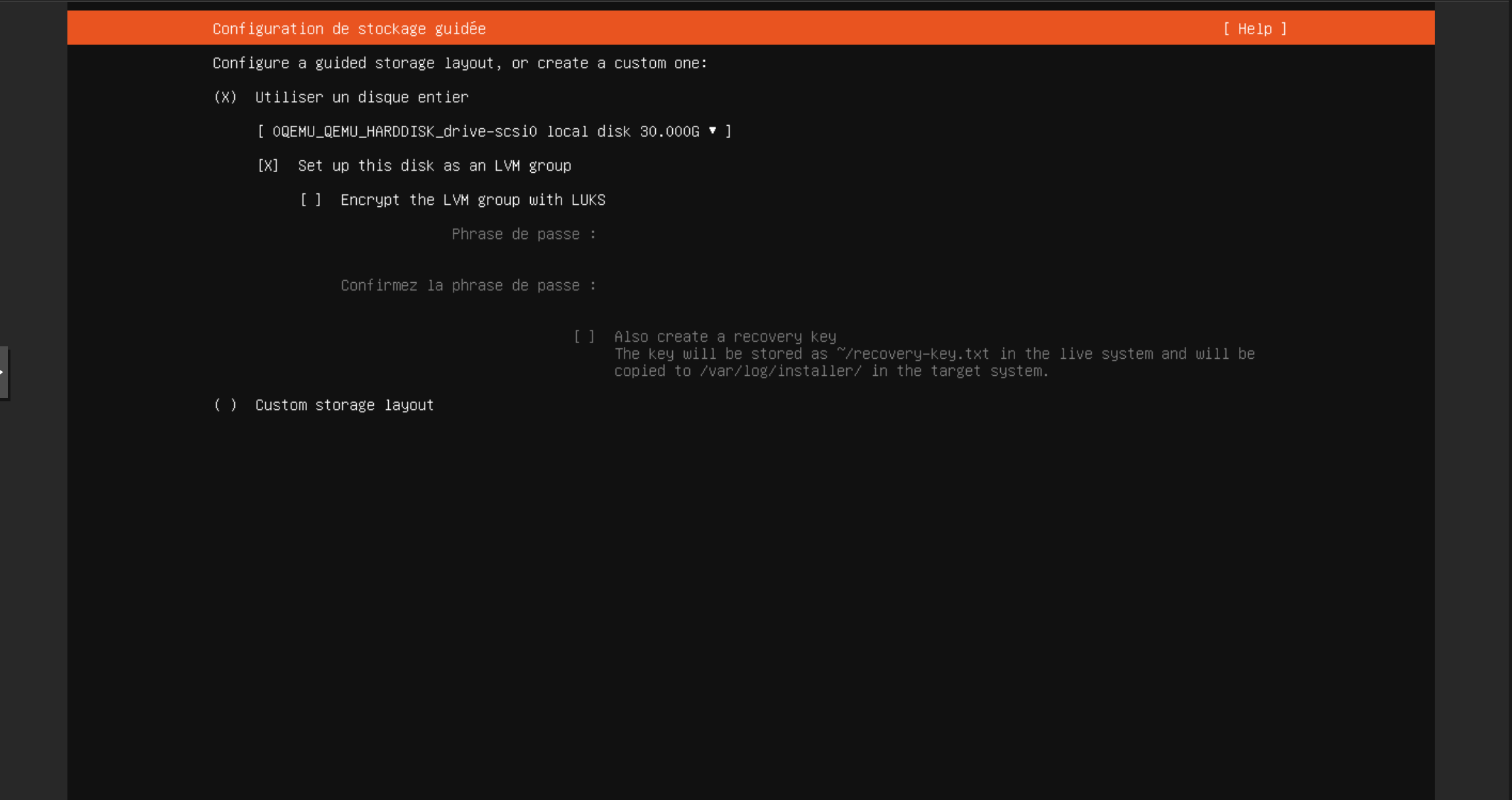 Choisir le disque principal du serveur (ex : /dev/sda). Laisser les options par défaut (ext4 ou zfs selon préférence).