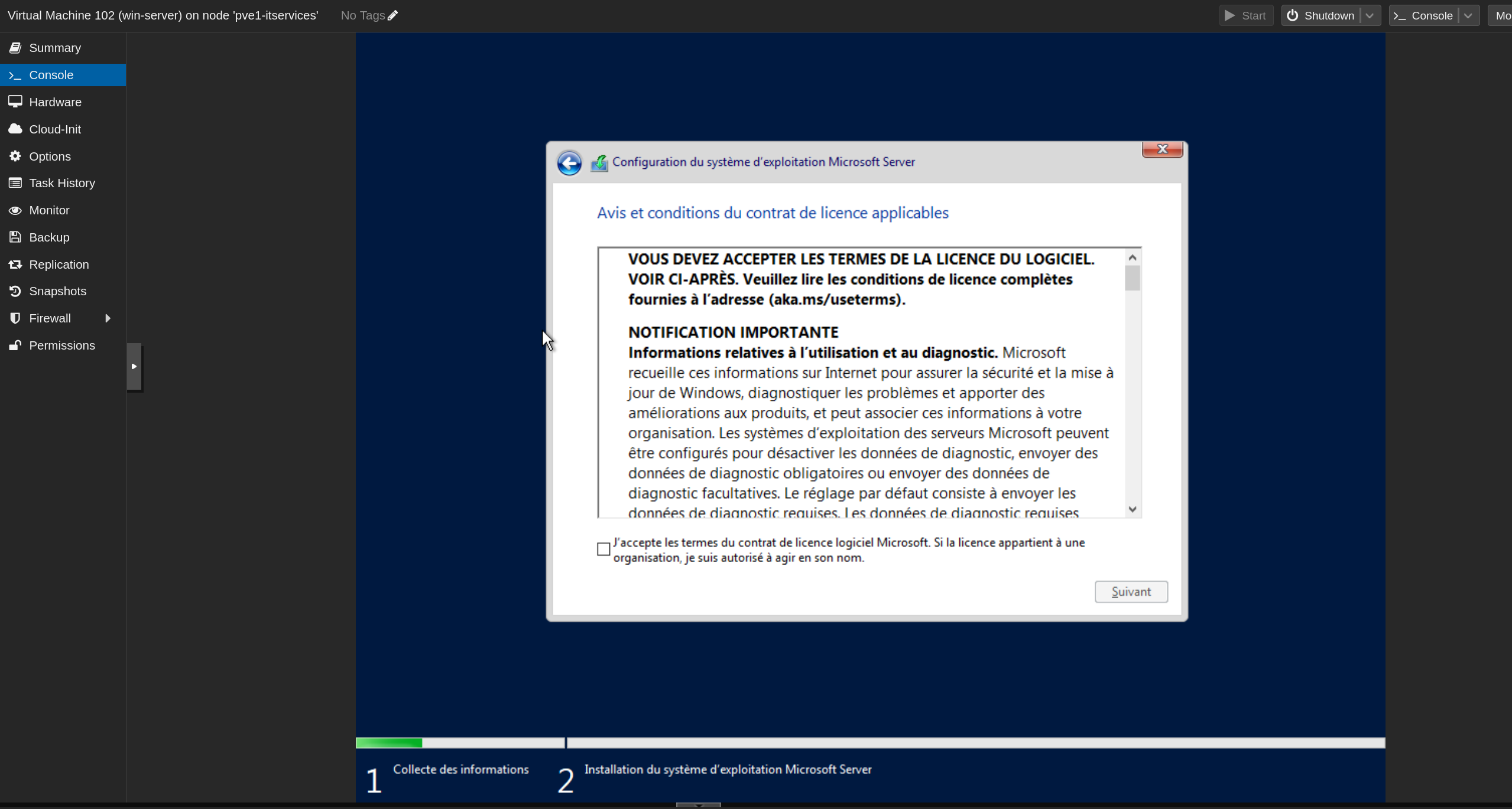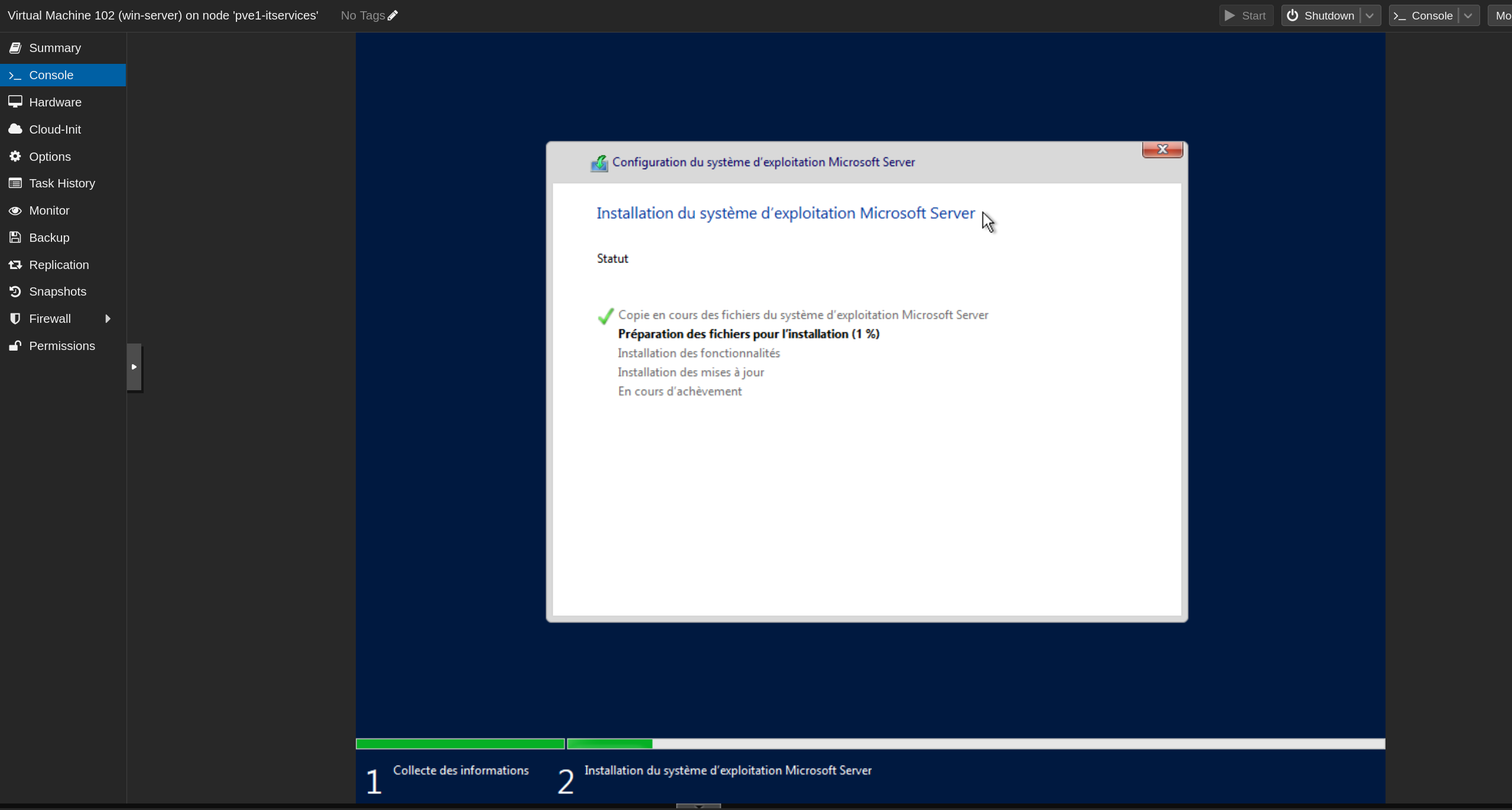 Cliquer sur Install et attendre la fin de l'installation (environ 5-10 minutes). Le serveur redémarre automatiquement.
