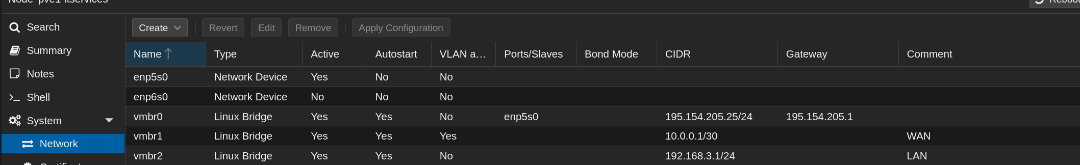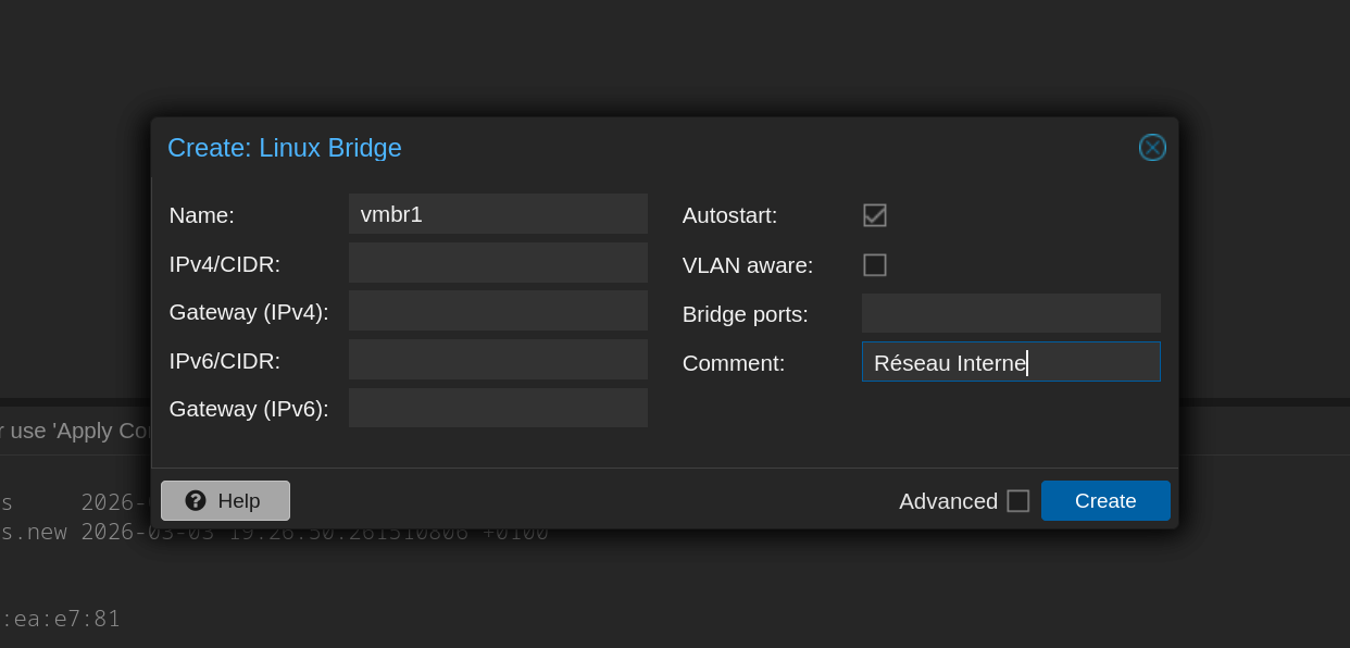 Dans l'interface web Proxmox : Nœud > Réseau