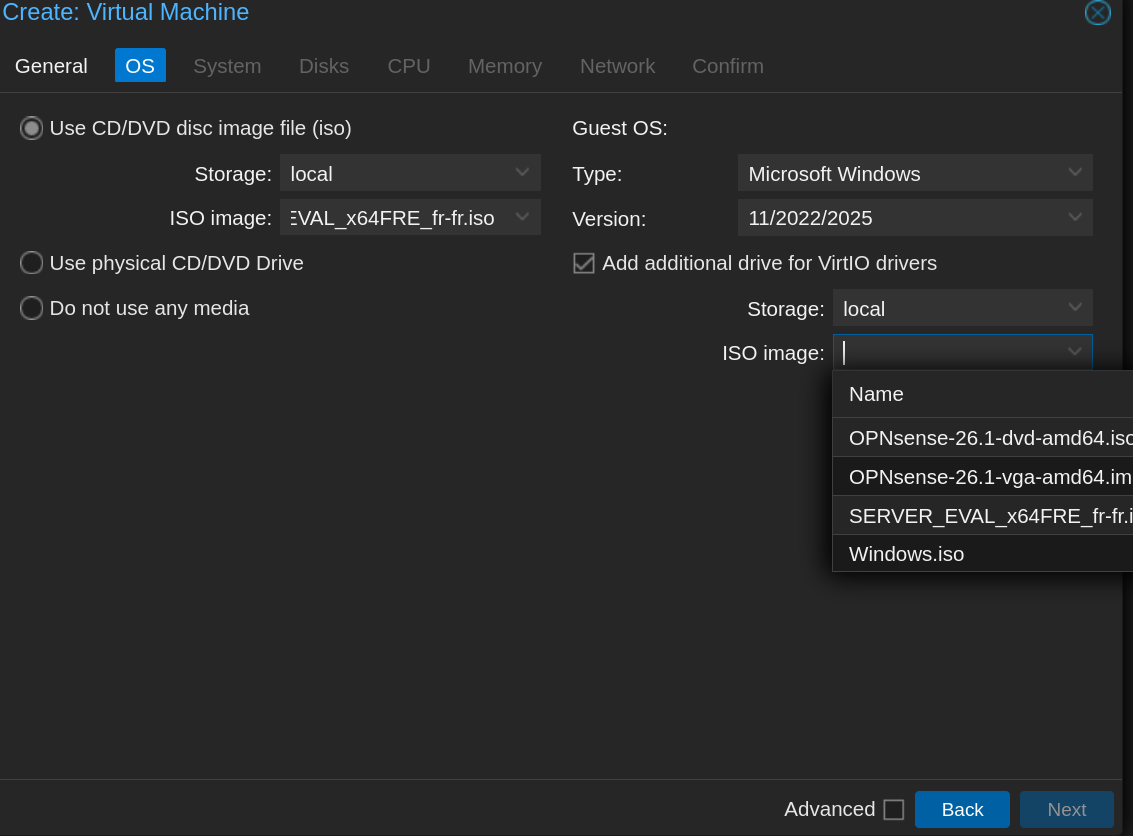 Important : Ajouter le CD-ROM des drivers VirtIO pour Windows (iso disponible sur le site Proxmox) afin que Windows reconnaisse le disque VirtIO pendant l'installation.