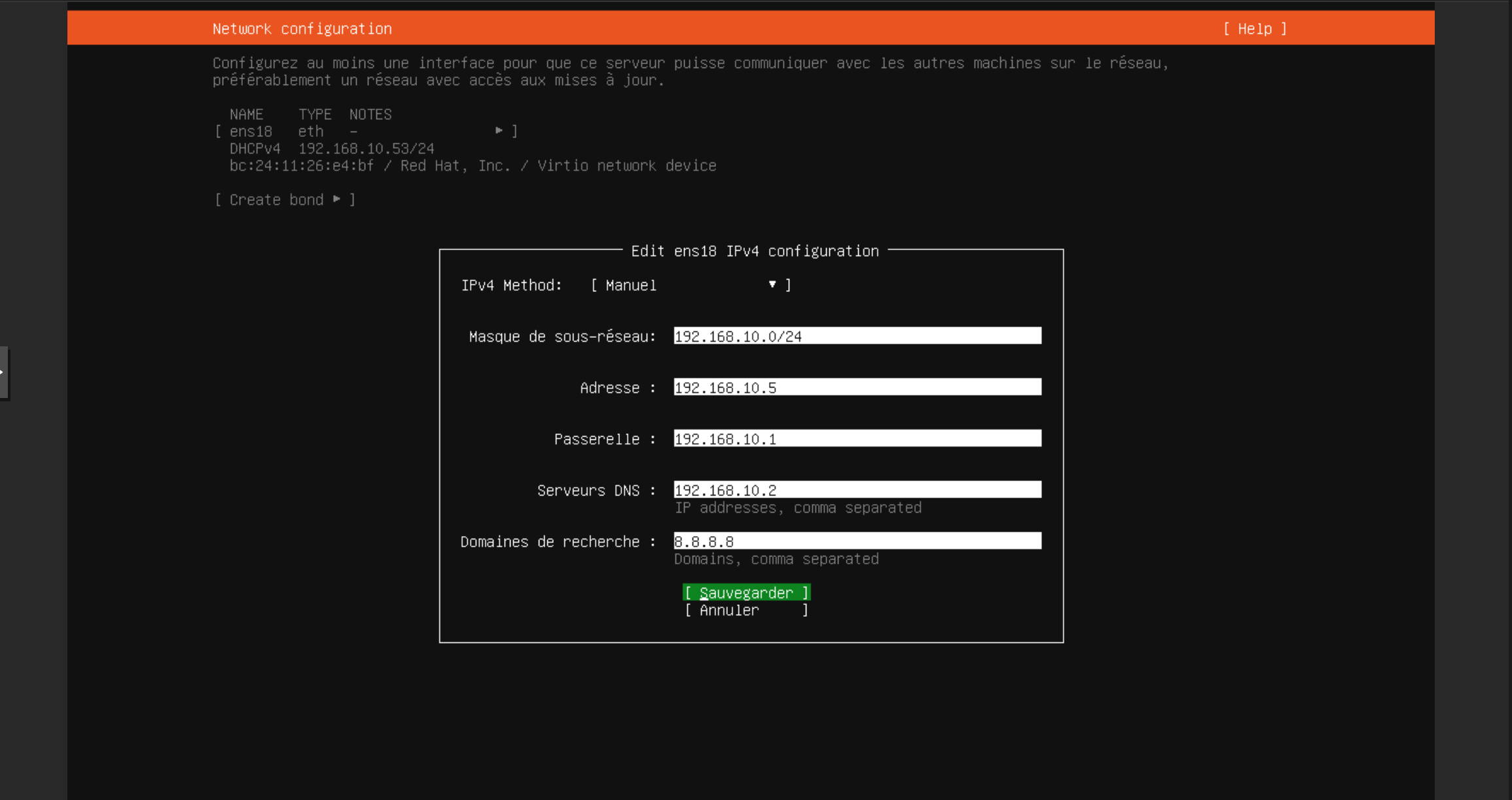 - Ports/Esclaves : ens3 (ou le nom de l'interface physique)